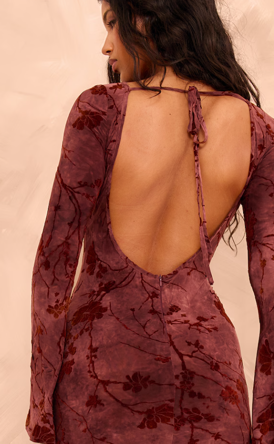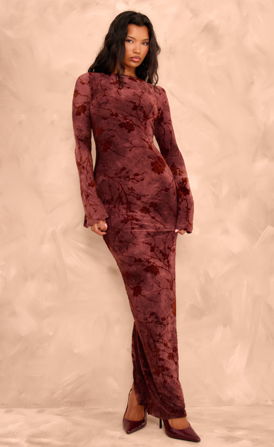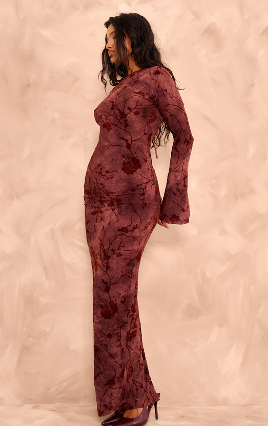 Introduce a touch of after-dark romance to your repertoire with this Dayana floral devore maxi dress. The intricate devore technique elevates the floral print, creating depth and texture within the rich burgundy hue. The long sleeves offer a sophisticated silhouette, balanced by the sweeping maxi length for a graceful drape. Consider offsetting the dress's inherent drama with delicate gold jewellery from our accessories collection;think fine chain necklaces or structural earrings;to complete the look.